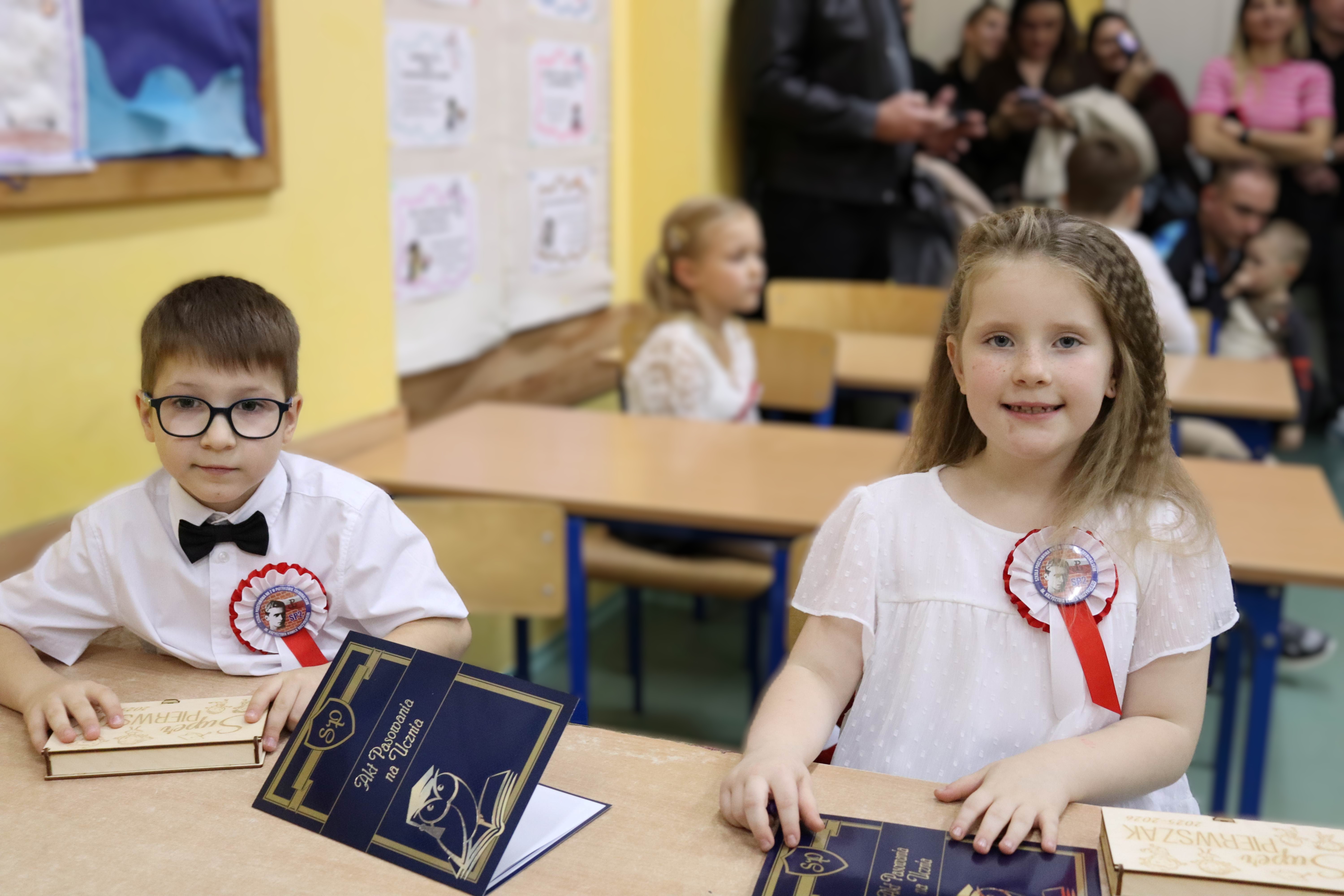 W niezwykle podniosłej atmosferze, przed pocztem sztandarowym, pierwszoklasiści ślubowali być dobrymi uczniami i Polakami. Po złożeniu ślubowania pani Dyrektor Katarzyna Błażejewska dokonała symbolicznego pasowania na ucznia.